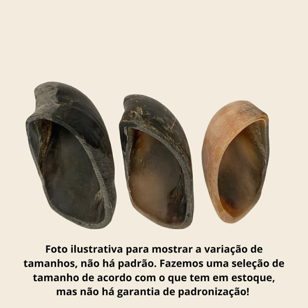 essa variabilidade é inerente a sua origem. Não há padronização, mantendo-os naturais de verdade. Os cascos são selecionados durante a montagem dos pedidos por tamanho ou perfil do cão, mas pode haver variação sempre, pois não há como garantir padronização de um produto que é variável de origem. Não temos como garantir uma padronização ou uniformidade dos cascos.