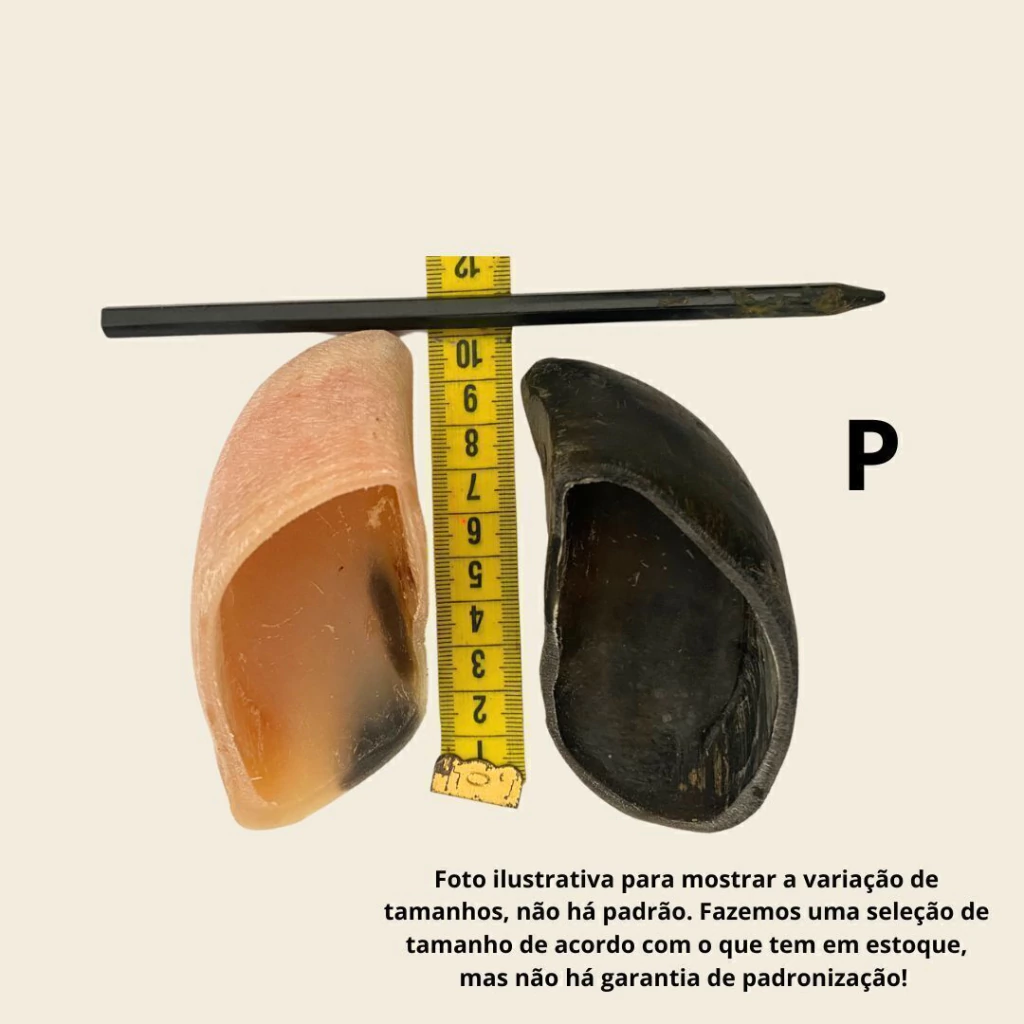 Seleção de tamanho: No momento da montagem do pedido fazemos a seleção do "tamanho" de acordo com o que tem em estoque. Não há uma padronização, de maneira geral: Tamanho P (cascos abaixo de 10cm, mais leves e finos), Tamanho M (acima de 10cm, são cascos de tamanho médios a grandes no geral, espessos, selecionados, dá pra cães de todos os portes consumirem).